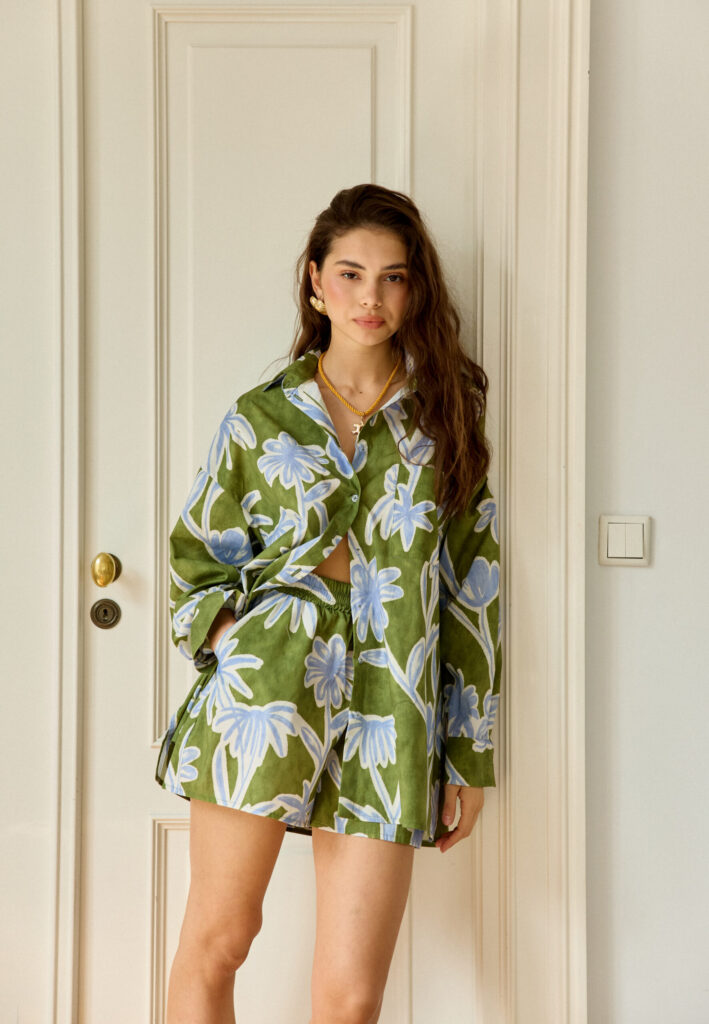 Stylowy komplet Ocean Palms to idealna propozycja na lato!Składa się z krótkich, wygodnych szortów na elastycznej gumce oraz stylowej koszuli z długim rękawem. Możesz nosić je razem jako zestaw lub osobno, tworząc zupełnie różne stylizacje – od casualowych po bardziej eleganckie.