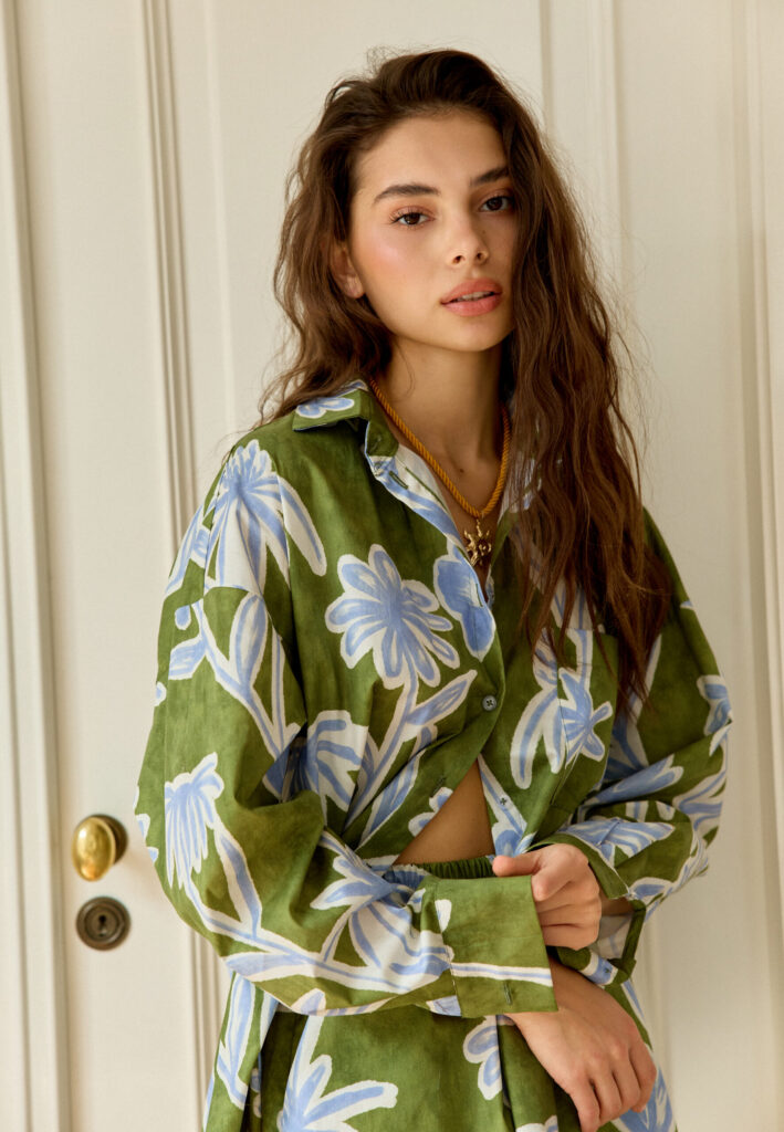 Przepiękny print niebieskich kwiatów na zielonym tle przywołuje na myśl palmy i wakacyjny klimat. Ten świeży, letni look z pewnością przyciągnie spojrzenia.